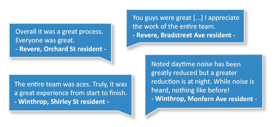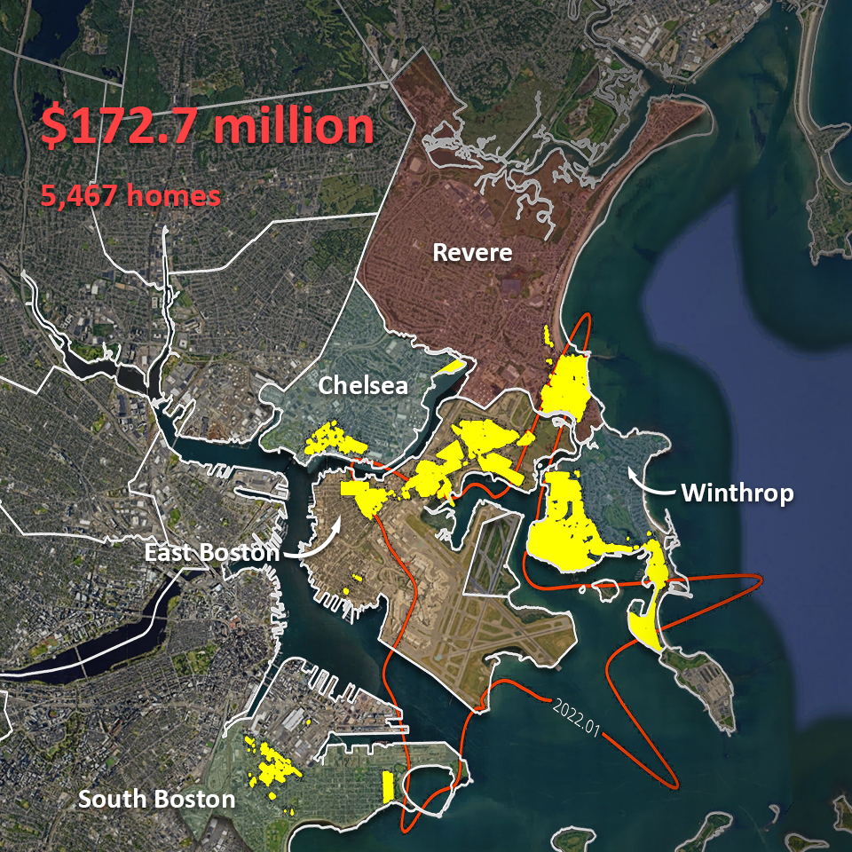 Massport has invested more than $172.7 million to reduce airplane noise in nearby neighborhoods. This investment has improved sound levels inside 5,467 homes across the communities of Revere, Chelsea, Winthrop, East Boston, and South Boston.